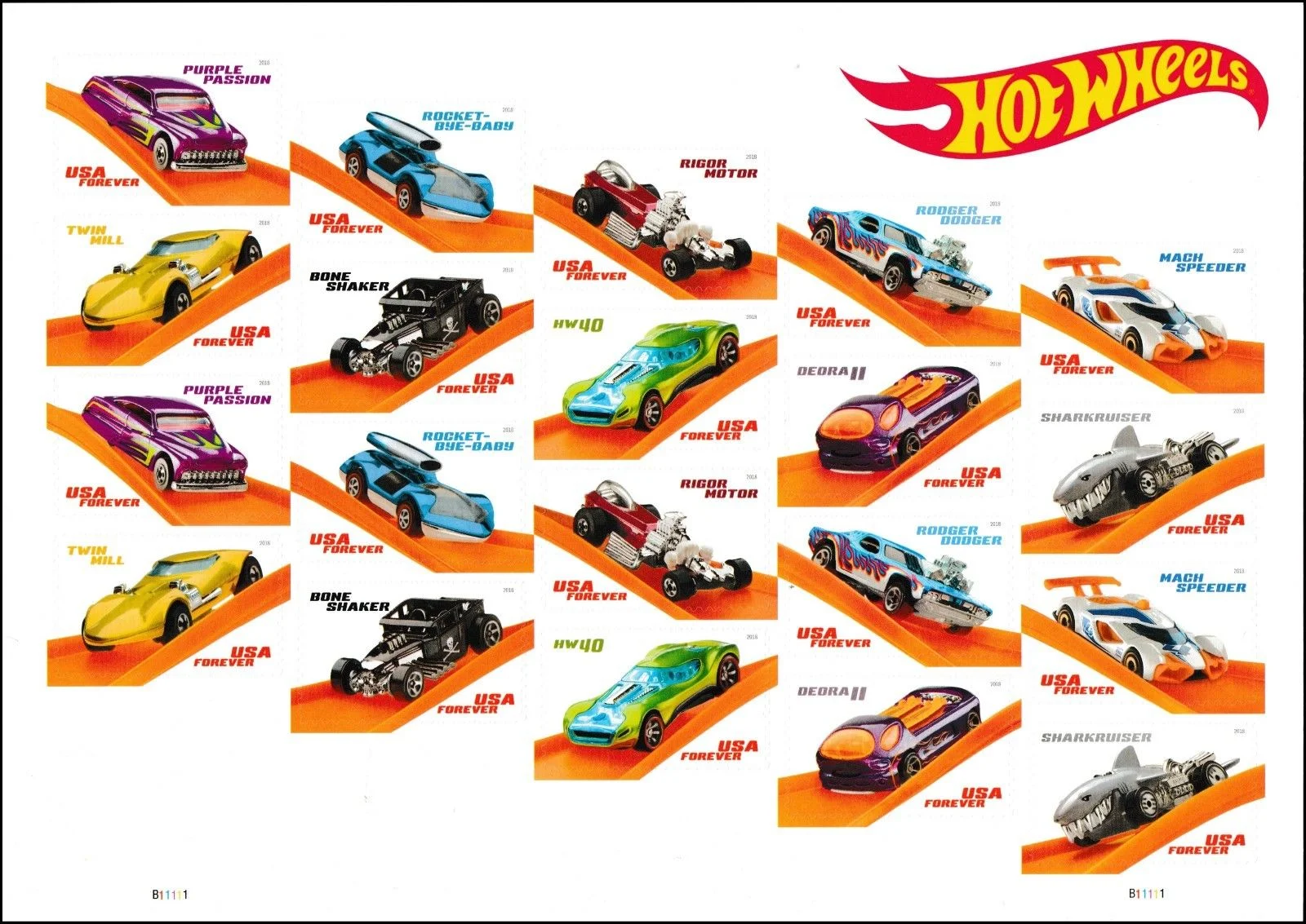 In celebration of Hot Wheels’ 50th Anniversary, the U.S. Postal Service today issued a pane of 20 Forever stamps showcasing some of the classic toy car’s most outrageous designs.