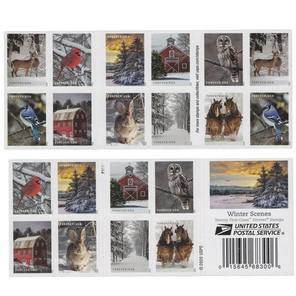 The stamp commemorates the beauty of a large red barn in a snowy landscape.