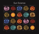 The Sun Science set includes 10 stamp designs, each picturing different sun details and phenomena. The colors represent different wavelengths, highlighting specific aspects of our sun.