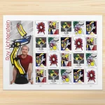 Roy Lichtenstein is honored with a stamp featuring his renowned work “Still Life with Crystal Bowl” (1972). The issuance took place on April 24, 2023, at the Whitney Museum of American Art in NYC. The set comprises five stamps highlighting different pieces by Lichtenstein. His experimental landscapes, influenced by comic art, showcase his distinctive Pop Art style. These landscapes, whether representational or abstract, demonstrate Lichtenstein’s innovative use of materials. In his later years, he revisited landscapes, concentrating on classical Chinese landscapes using halftone dots.